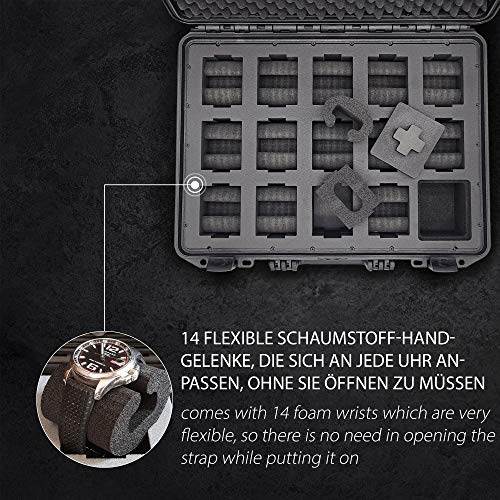 MC-CASES ® Uhrenkoffer Transportkoffer für bis zu 14 Uhren – Reisekoffer – Wasserdicht – Abschließbar – Perfekt für Reisen – Extrem geschützt – Made in Germany (Platz für 14 Uhren)
