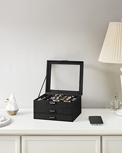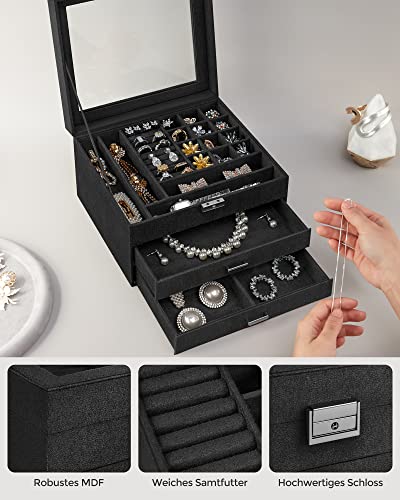 SONGMICS Schmuckkasten, Schmuckkästchen mit 3 Ebenen, Schmuckbox, Samt, mit Glasdeckel, mehrere Fächer für Halsketten, Armbänder, Ringe, mit Schloss und Schlüssel, schwarz JBC158B01